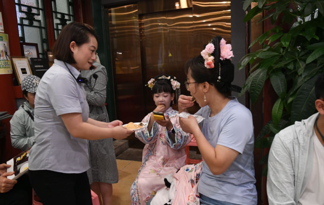 同和居服务人员为等位顾客送上月饼 “八大春”之首、江苏菜名店同春园的亲子活动则吸引了不少大朋友和小朋友。据工作人员介绍,华天在中秋假期举办了“秋之味”美食节的中秋专场活动——“捏个月亮庆团圆”,小朋友们在同春园首席面点师赵晓华的带领下,做出了好看又好吃的苏式月饼。“太有意思啦,我要把月饼带回家给姥姥吃。”参加活动的小朋友恬恬说道。