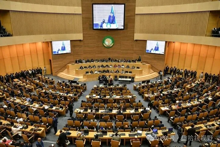 这是2月15日在埃塞俄比亚首都亚的斯亚贝巴拍摄的会议现场。新华社记者 韩旭 摄 在今年2月举行的非洲联盟峰会上,与会领导人聚焦纠正历史不公。各国期待通过推进区域一体化和非洲大陆自贸区建设,努力将庞大人口规模和统一市场优势转化为内生增长动力,希望从根本上缓解殖民统治遗留的结构性脆弱、治理失能和产业基础薄弱等问题,逐步走出治理困境。