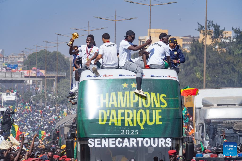 Players of the Senegalese football team take an open-top bus and celebrate with thousands of cheering fans during a victory parade in Dakar, Senegal, Jan. 20, 2026. Senegalese football team, "Lions of Teranga", continued their victory parade through the streets of Dakar after winning the Africa Cup of Nations title on Jan. 18 in Rabat, Morocco. (Photo by Aliou Mbaye/Xinhua)
