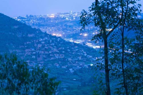 首都基加利三面环山,整座城市坐落在海拔1500米的八个山头上,已有100多年的历史。基加利的人口已经从1960年的6000人现已发展到100多万。蜿蜒起伏的马路纵横交错,把基加利市区的八个山头连成一体。街道两旁绿树成荫,花草繁茂。几乎每个山头都有一个圆形大花坛,有的矗立着雕像,有的配有漂亮的喷水池,通往各区段的路向周边辐射,乘直升机俯瞰全景一定可以大饱眼福。