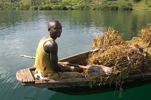 卢旺达的著名景点基武湖_一名男子用小船装运柴草