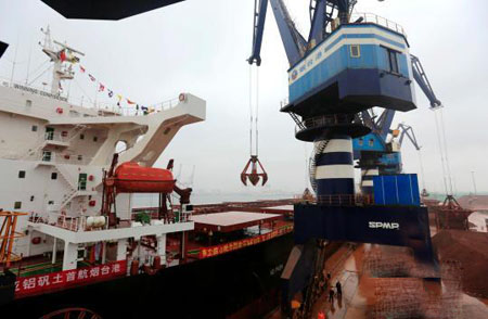 16日上午,在烟台港芝罘湾港区66号泊位,从非洲几内亚驶来的满载铝土的“韦立信心”号货轮开始接卸作业,标志着从非洲矿山到中国终端厂家用户的铝土矿运输通道成功打通。