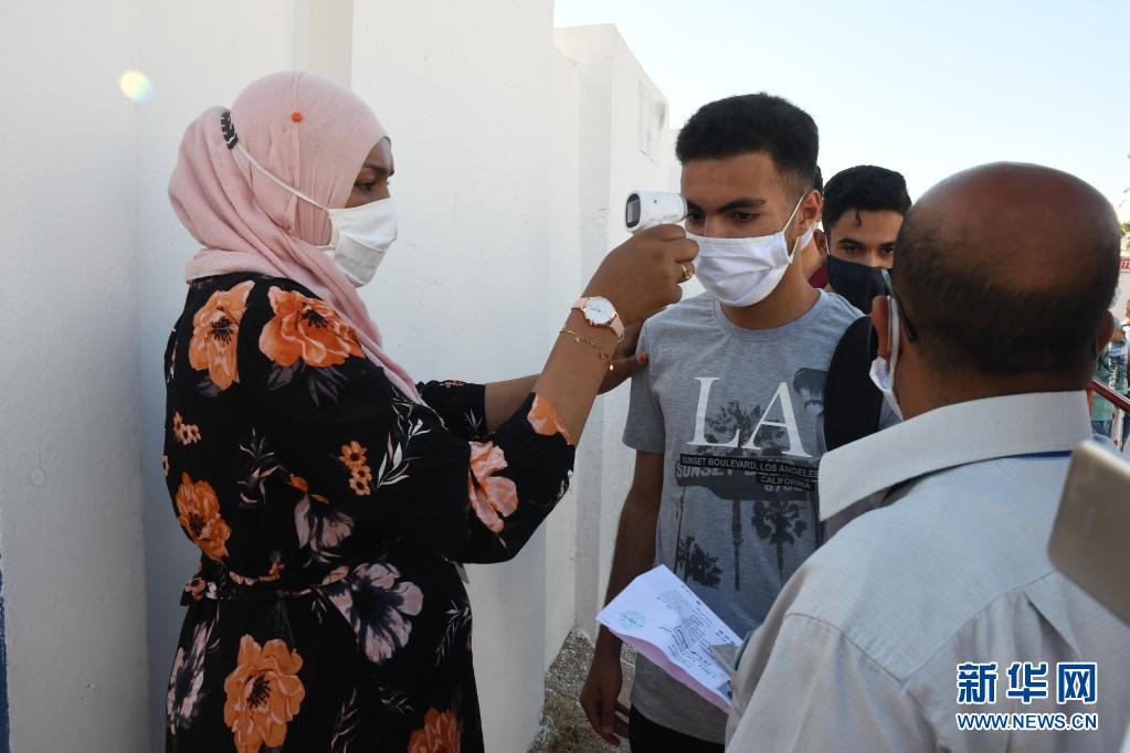 ![]() 6月16日,工作人员在突尼斯首都突尼斯市一个考场外给准备参加高等学校入学考试的学生测量体温。
