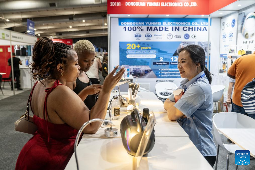 Visitors communicate with an exhibitor (R) at the ninth China-South Africa Trade Fair in Johannesburg, South Africa, Sept. 23, 2025.