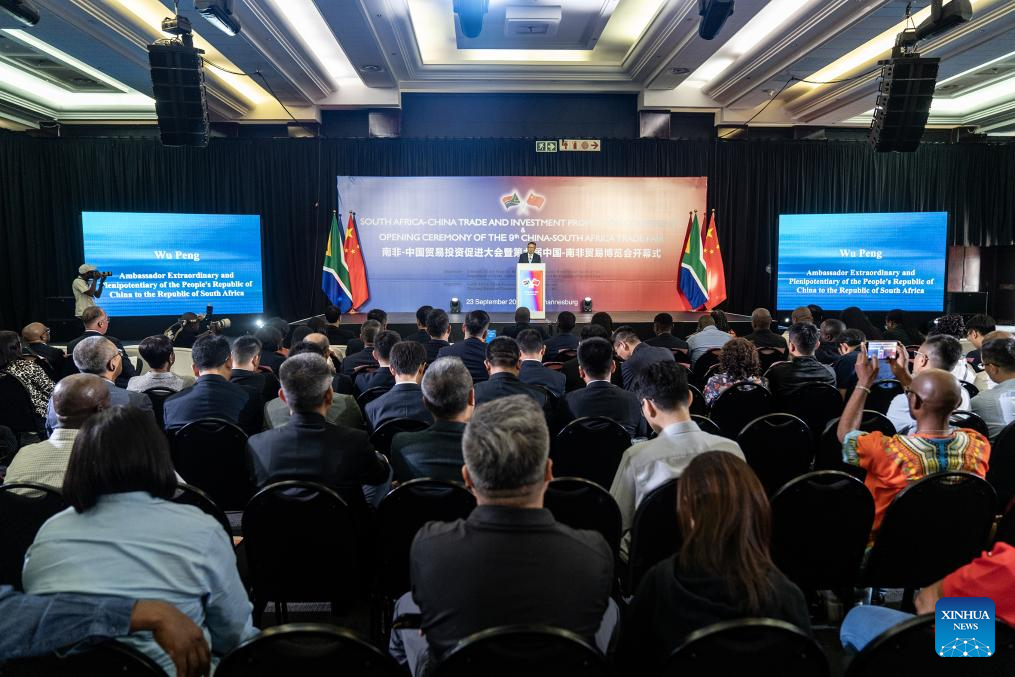 Chinese Ambassador to South Africa Wu Peng addresses the opening ceremony of the South Africa-China Trade and Investment Promotion Conference and the ninth China-South Africa Trade Fair in Johannesburg, South Africa, Sept. 23, 2025.