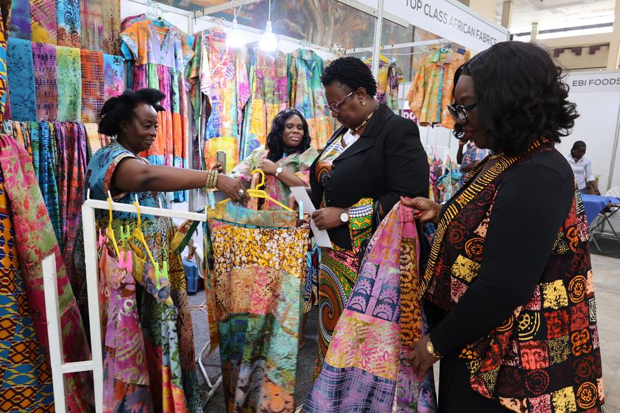 People visit a local fabric booth during the fourth Made-in-Ghana Bazaar in Accra, Ghana, Sept. 5, 2025. (Photo by Seth/Xinhua)