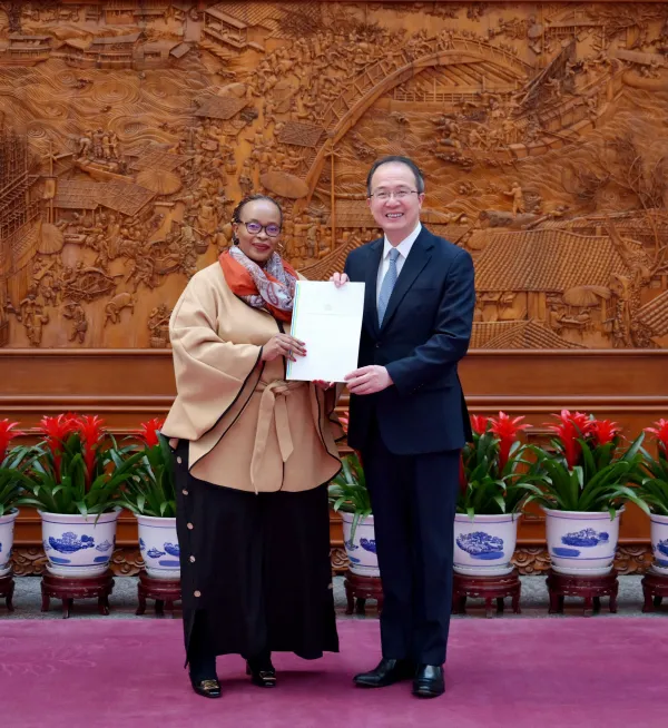 2025年12月3日,外交部部长助理兼礼宾司司长洪磊接受莱索托新任驻华大使林梅递交国书副本。林梅大使于11月28日抵华。(来源:外交部)