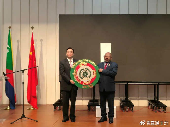 阿扎利总统向黄大使赠送纪念牌,并在致辞中盛赞科中友谊树立了国际关系典范,感谢中国长期以来对科帮助,表示科坚定恪守一个中国原则,全力支持中国统一大业。