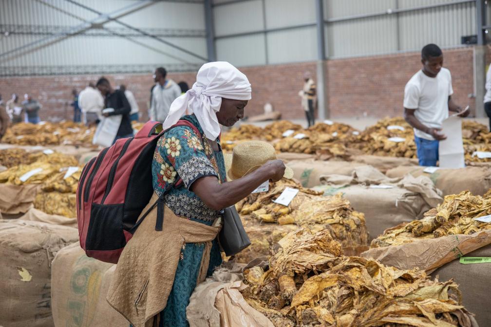 A trader checks tobacco at a tobacco auction floor in Harare, Zimbabwe, March 4, 2026. (Photo by Shaun Jusa/Xinhua)