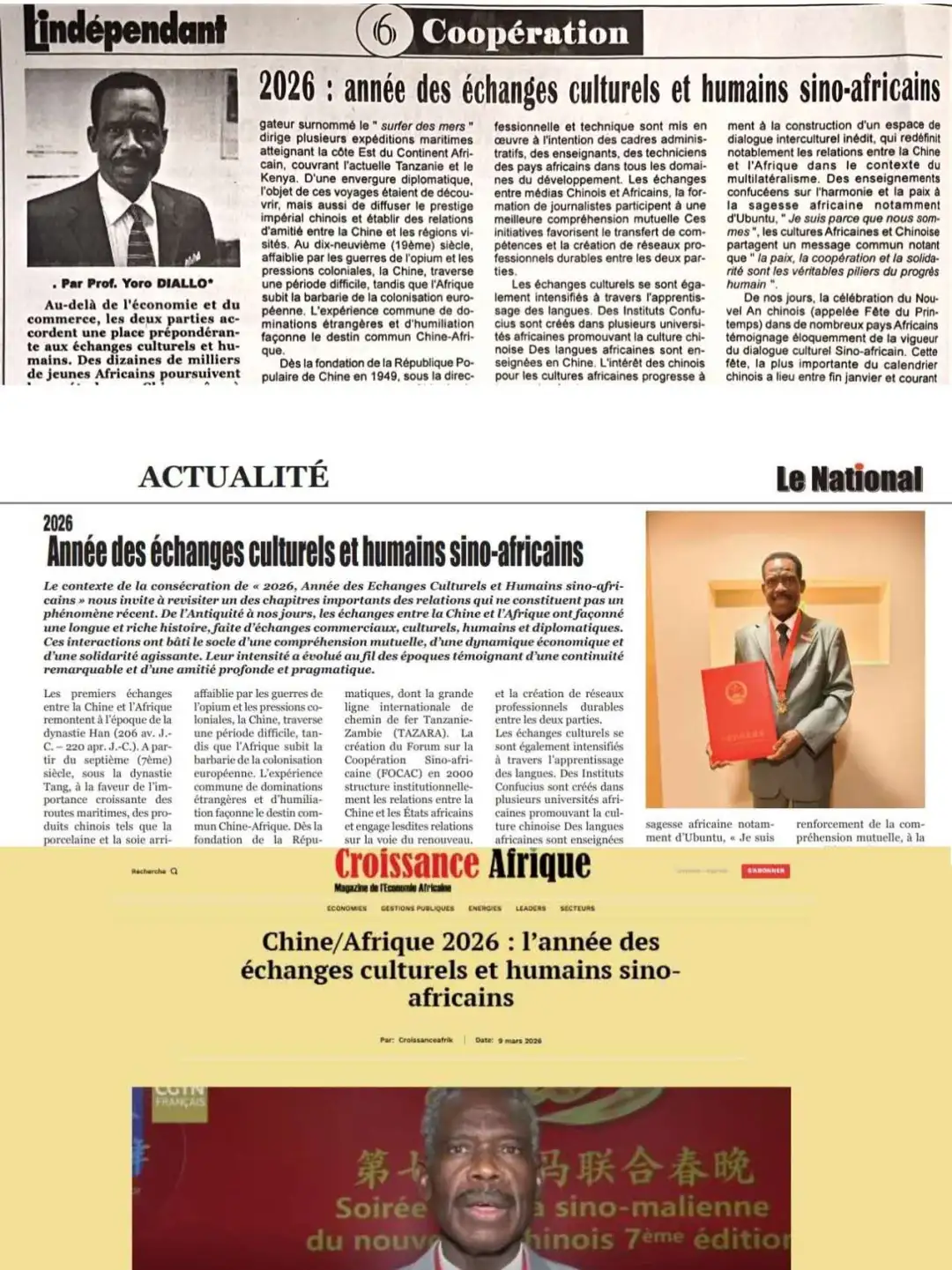 中国政府友谊奖获得者、马里知名学者迪亚洛教授在马媒体发表文章宣介“中非人文交流年”