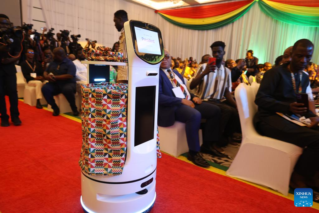 A delivering robot is pictured during the launching ceremony of Ghana's National Artificial Intelligence (AI) Strategy in Accra, Ghana, on April 24, 2026. Ghanaian President John Dramani Mahama on Friday launched the country's National Artificial Intelligence (AI) Strategy, pledging 270 million U.S. dollars to accelerate the development of the sector. (Photo by Seth/Xinhua)